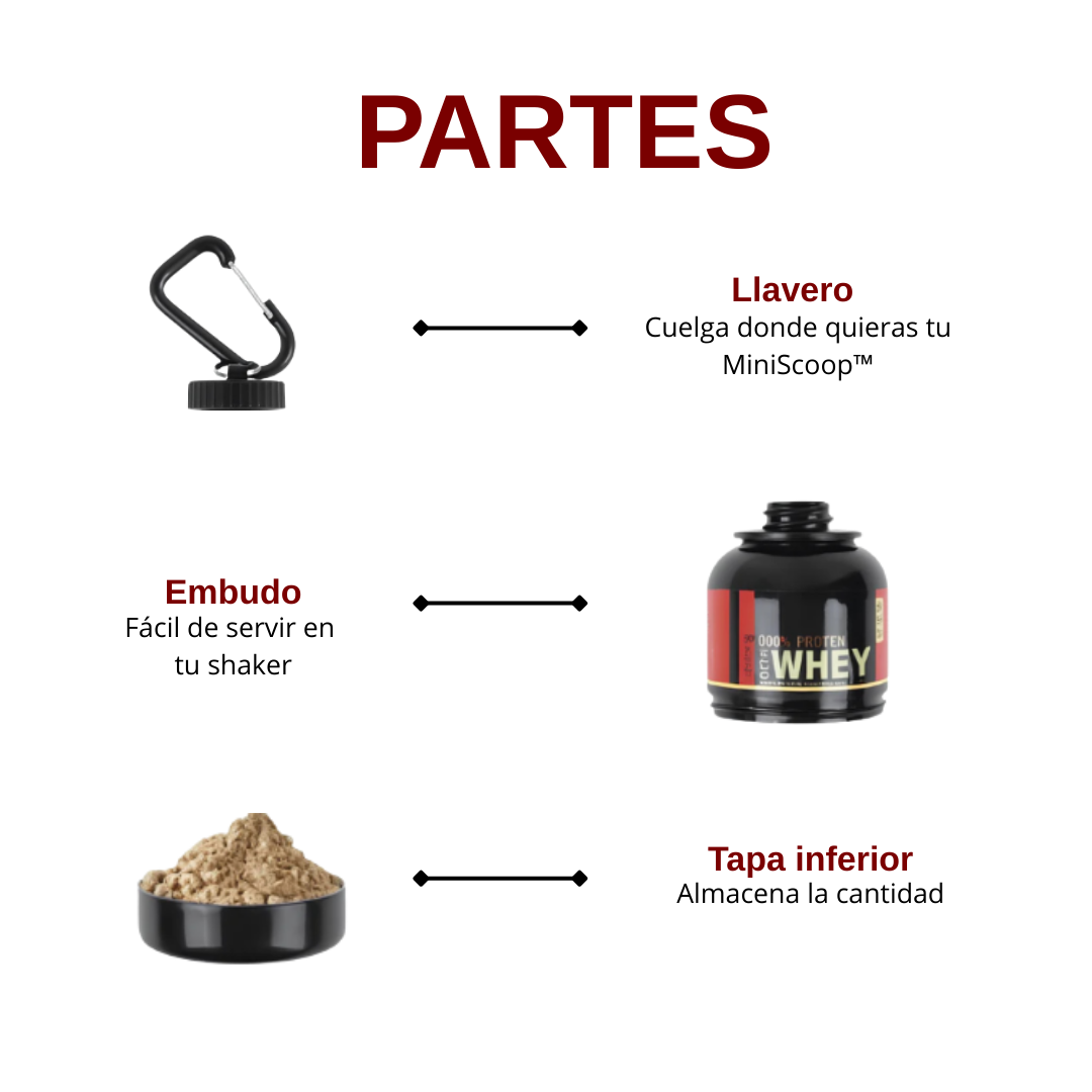 Un diseño 3 en 1: llavero para transportarlo, embudo para verter sin derrames y tapa inferior para almacenar tu scoop de forma segura.